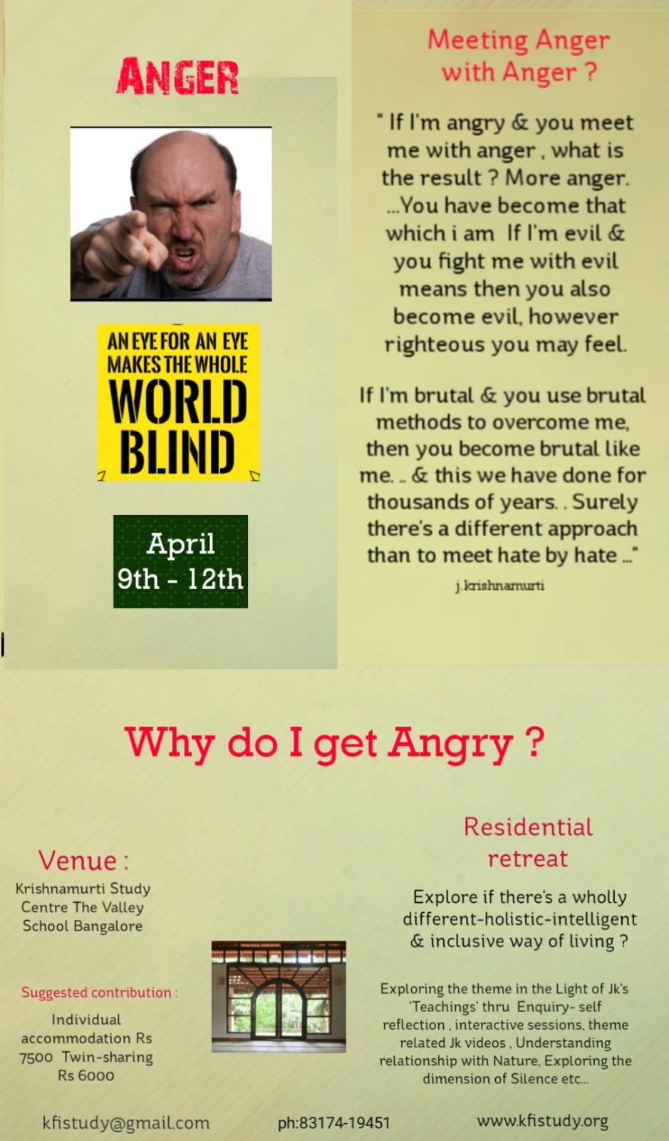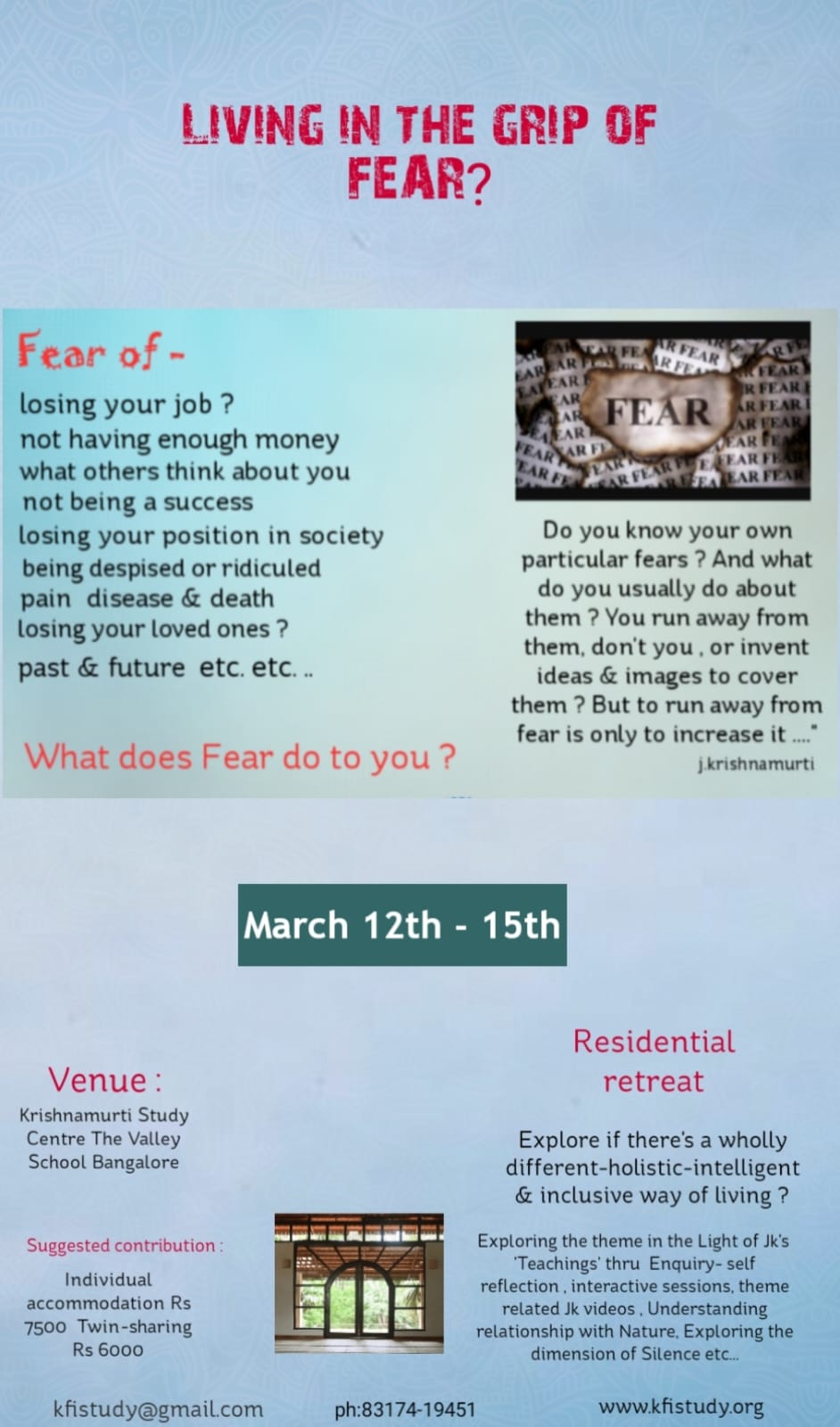 This is the website for Study Centre, Bangalore located within the green and spacious campus of the Valley School. The Study Centre was initiated by J. Krishnamurti. The Centre offers a quiet space, away from one’s daily routine, for reflecting on one’s life in the light of Krishnamurti’s teachings. The Study Centre is set in a place of great natural beauty and silence. The Study Centre offers a simple and austere way of living for seekers of truth.